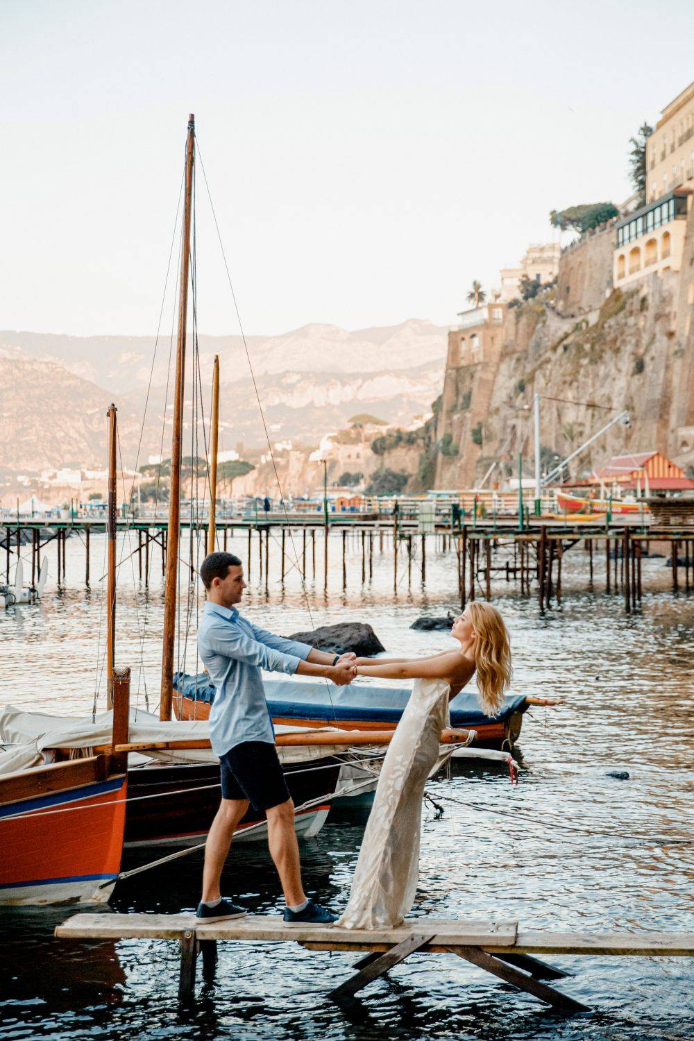 Популярный вариант – кружиться вокруг своей оси: развевающиеся платье и волосы придают женскому образу больше экспрессии. Можно обыграть эту позу для фотосессии пары, имитируя танец влюблённых.