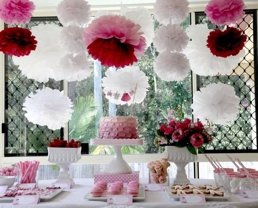 Над столом нужно повесить потолочные украшения в виде шаров, гирлянды, украшений из бумаги.
