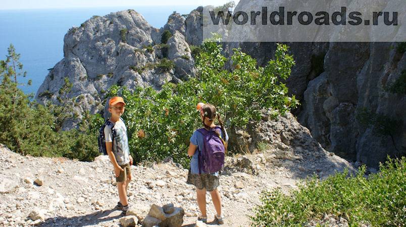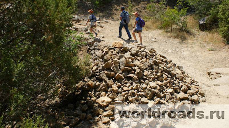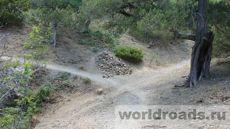 Начало этого маршрута Караул-Обы помечено туриком, небольшой пирамидкой из камней. Если отсюда пойти налево и вниз, можно выйти на Царский пляж. Но сейчас мы наверх.