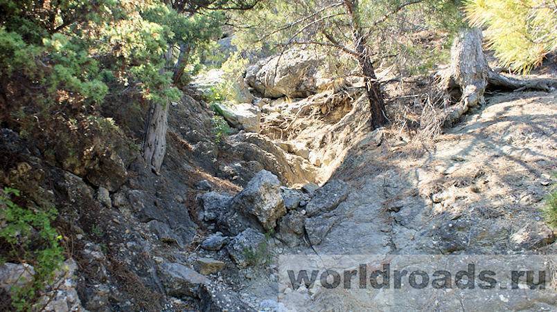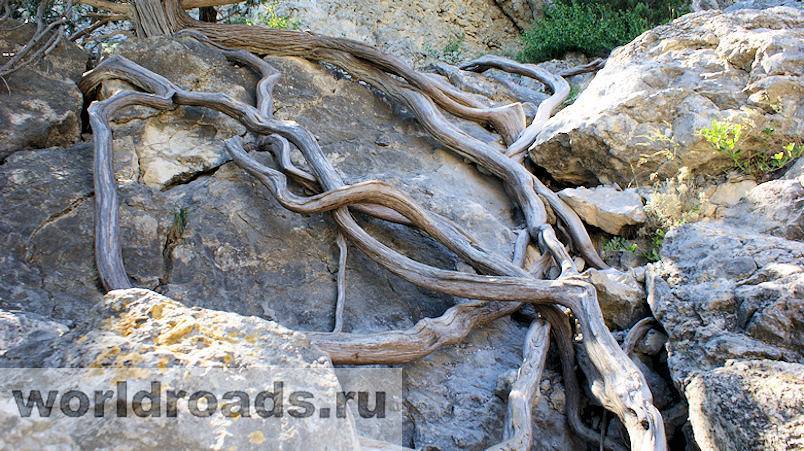 Вначале – почти отвесный участок скалы. Если бы не природная шведская стенка, образованная переплетениями можжевеловых корней, спускаться было бы непросто.