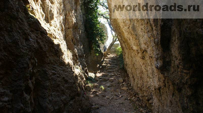 Из лабиринта выходим к полуразрушенным ступенькам в скале. Это всё тоже таврские лестницы. Но это ещё не та самая знаменитая Лестница Тавров. Эти лестницы прямые, в туннелях. Лестница Тавров – винтовая, она внутри гигантской расщелины в скале.