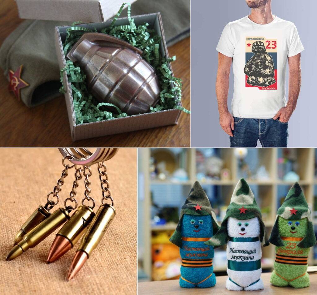 Чашки, пепельницы, зажигалки, футболки с корпоративной символикой или шуточными надписями, например, «Майор дизайна», «Маршал продаж», «Верховный главнокомандующий маркетингового отдела». В качестве презента подойдут и аксессуары в военном стиле: фляги, часы, наборы для похода, необычные сувениры.