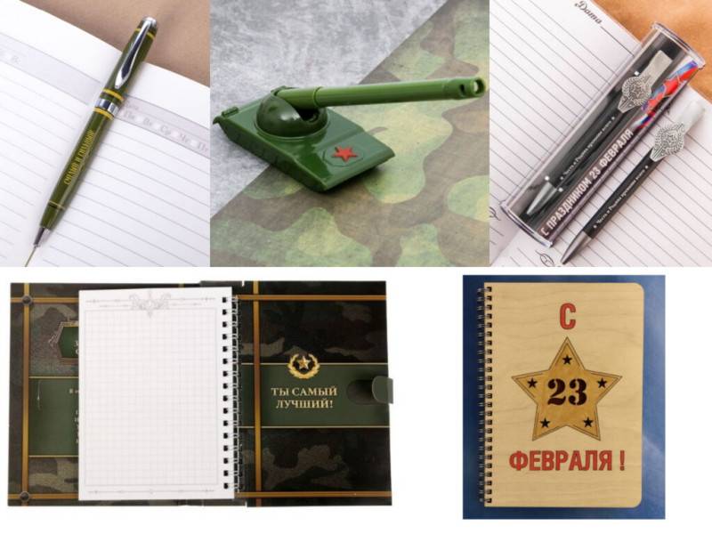 Чашки, пепельницы, зажигалки, футболки с корпоративной символикой или шуточными надписями, например, «Майор дизайна», «Маршал продаж», «Верховный главнокомандующий маркетингового отдела». В качестве презента подойдут и аксессуары в военном стиле: фляги, часы, наборы для похода, необычные сувениры.