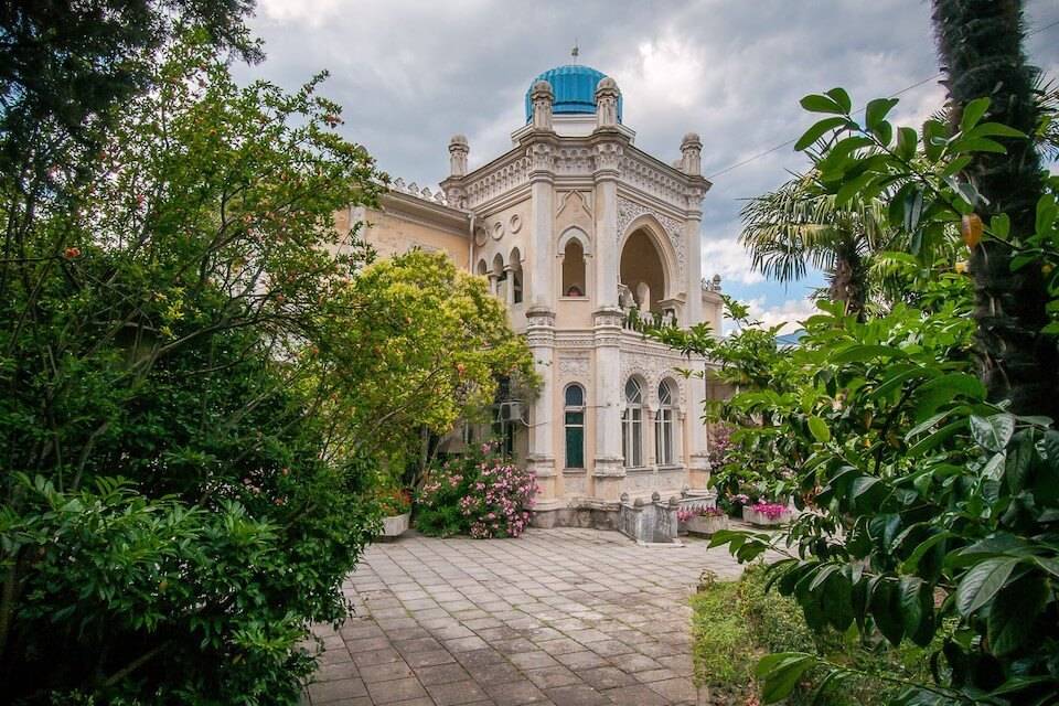 На фоне нежной цветовой гаммы фасадов, изысканность мавританскому экстерьеру придают декорированные ажурной резьбой колонны с изящными капителями, обрамление арочных окон и зубчатый парапет. К дворцу ведет мраморная лестница, охраняемая в конце скульптурами львов. В наше время дворец эмира Бухарского занят одним из корпусов санатория «Ялта» и увидеть его внутреннее оформление можно только с экскурсией.