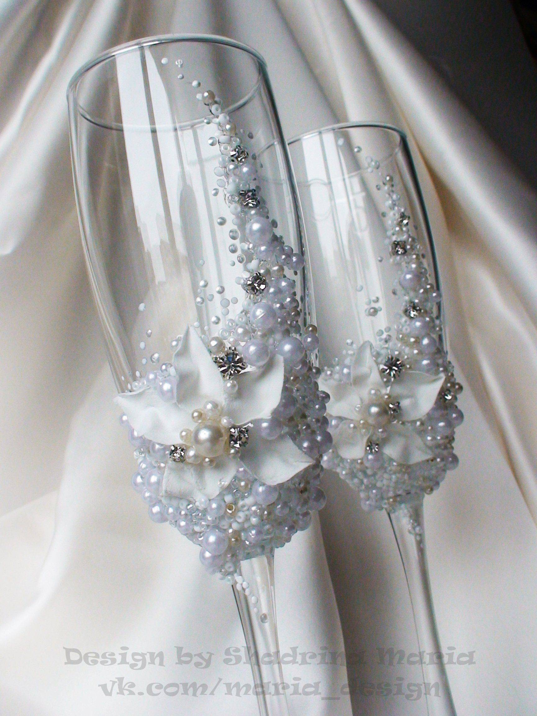 Их часто применяют для декора, потому что процесс создания бокала очень прост. Можно взять белые атласные ленты средней ширины и обернуть ими бокалы. Дальше сверху выкладываем и приклеиваем небольшую нитку, на которую нанизаны белые бусины (цвет можно менять).