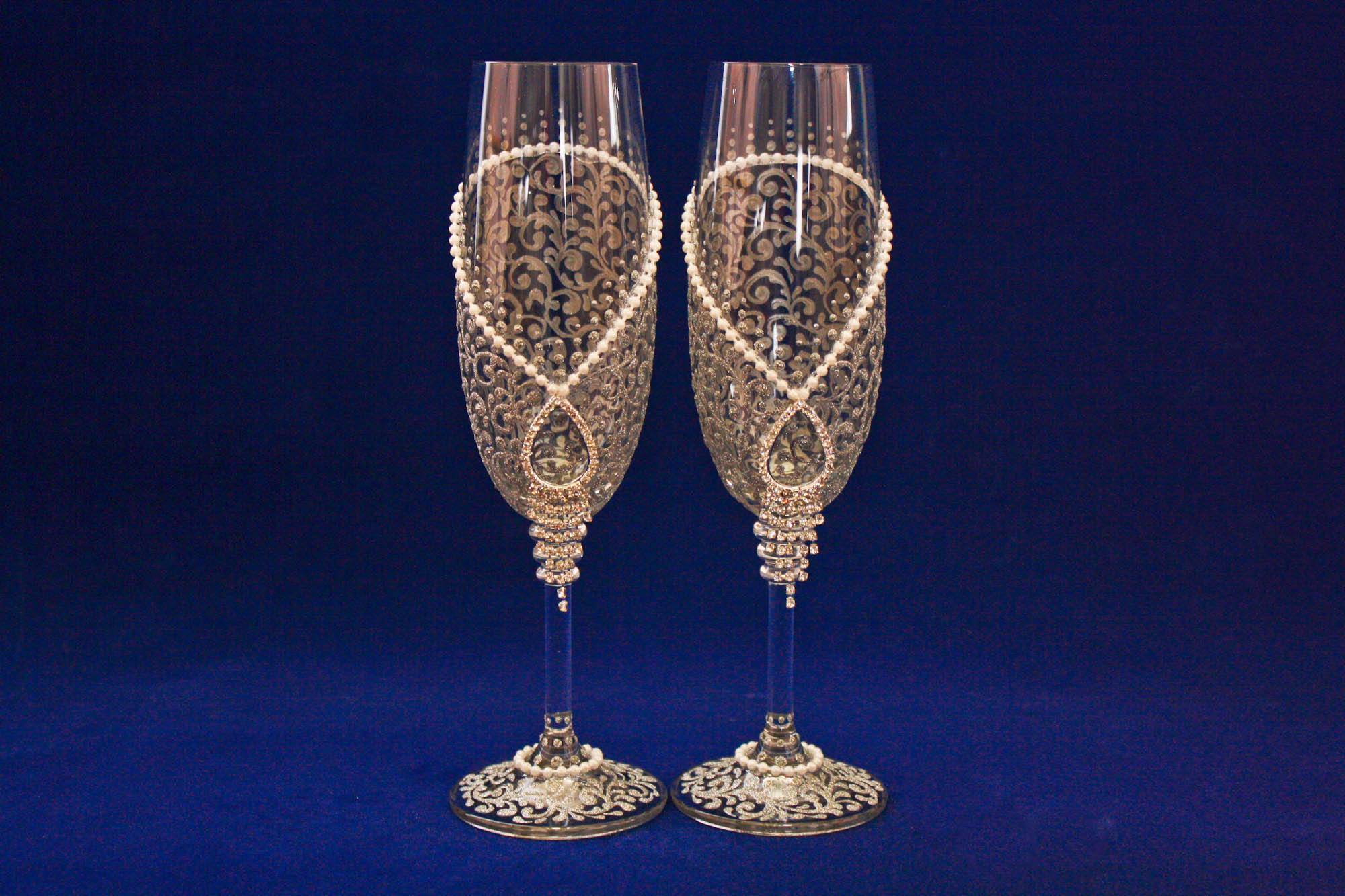 - Украшение стразами, блестками, жемчугом и камнями, придающими бокалам блеска и гламура (такие сверкающие бокалы для свадьбы не только будут выполнять свою непосредственную роль, но и станут эффектными фокусными элементами на свадебном столе).