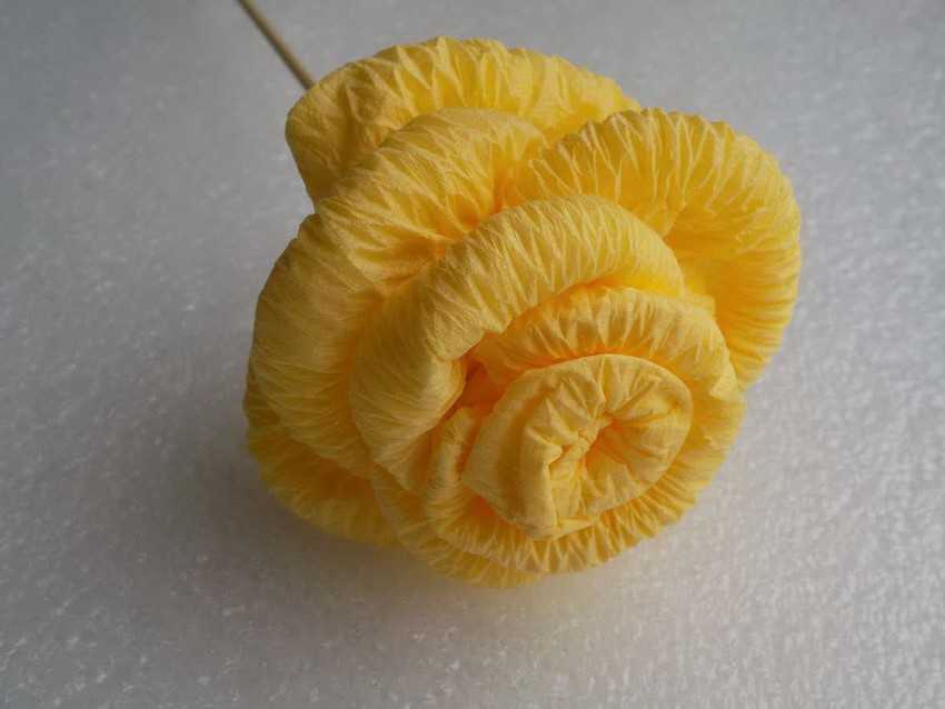 Вырезать из креп-бумаги деталь, изображенную на фотографии и обернуть её вокруг палочки, раскрыть листья и перевязать ниточкой. Можно составить восхитительный