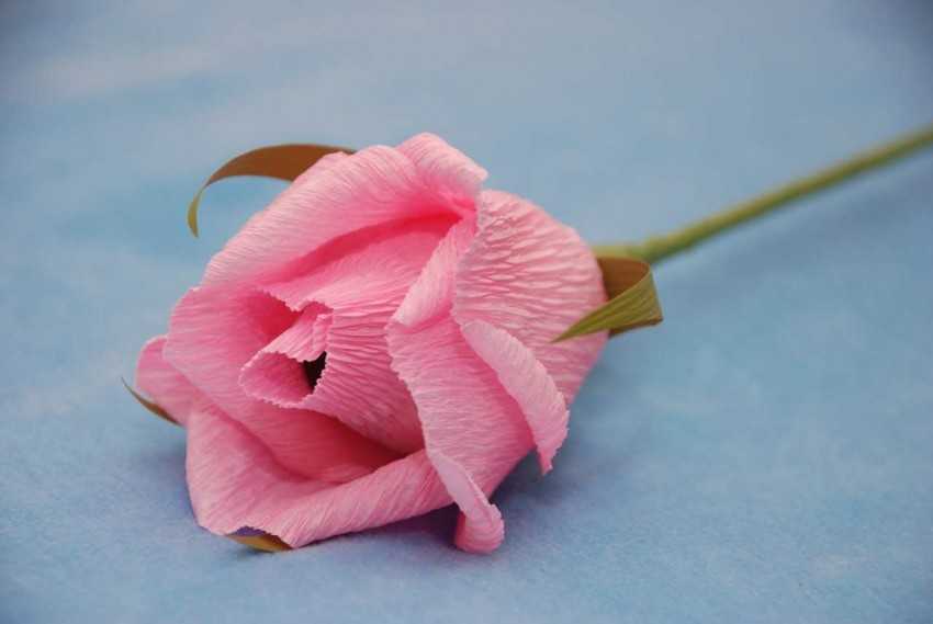 Вначале делаются картонные шаблоны лепестков и обводятся на бумаге. Для одного цветочка потребуется пять-шесть маленьких лепестков, столько же средних, больших. Вырезаются они с соблюдением фактуры гофры. После собирается центр бутона из пяти-восьми скрученных, склеенных между собой лепестков, которые следует слегка изогнуть. Конструкция надевается на проволоку, обвязывается ниткой для прочности, потом наклеиваются остальные лепестки. На проволоку-стебель надевается флористический рукав, который декорируется зеленой гофрой, тканью креп, из которой выполняют листья.