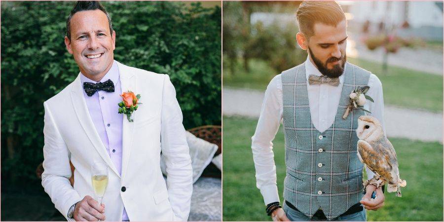 Главное помнить, что жених должен гармонировать с невестой. К примеру, с серым мужским нарядом хорошо будет смотреться как нежное белое платье новобрачной, так и серое. А вот с цветным луком парня, девушке лучше остановить свой выбор на чем-то светлом, чтобы пара выглядела не слишком пестро.