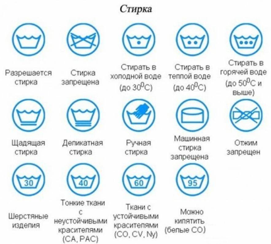Под стиркой подразумевается процесс очистки одежды от различного рода загрязнений, а также обеззараживание и восстановление первоначальных свойств белья. Чтобы правильно провести мероприятие и не навредить ткани, необходимо придерживаться рекомендаций производителя. Как правило, информацию о размещают на небольших кусочках ткани, называемых ярлыками. Так как словесное описание занимает много места, принято пользоваться значками и обозначениями.