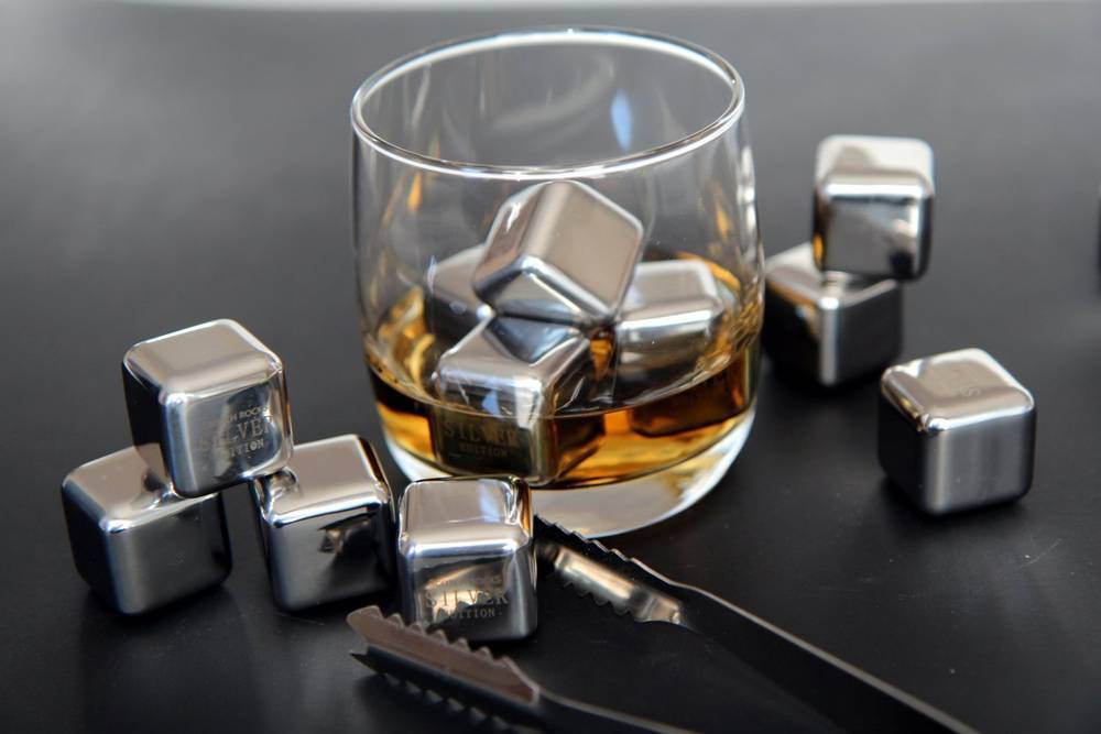 - Набор стальных кубиков, которые заменяют лёд в напитках — практичный и нужный подарок. Они охлаждают напиток и при этом не разбавляют его.
