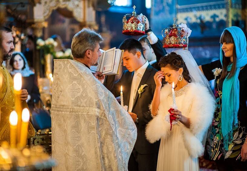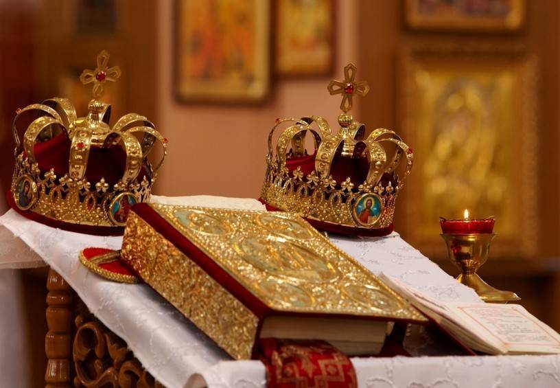 Венчание происходит в центральной части храма, куда обрученные молодожены проходят вслед за батюшкой. Священник задает вопросы, нет ли преград для совершения Таинства, по своей ли воле молодые пришли в церковь. Снова начинается чтение молитв, на головы пары возлагают венцы, у них три символических значения – это царствование (то есть честь и слава человеку, как венцу творения Божьего), венцы мучеников, это символ мученичества супругов, который каждый день в браке борются со своим эгоизмом, а также венцы, открывающие путь в Царство Божье – молодых туда приведет благочестивая жизнь. После венчания супруги считаются таковыми и перед Богом.