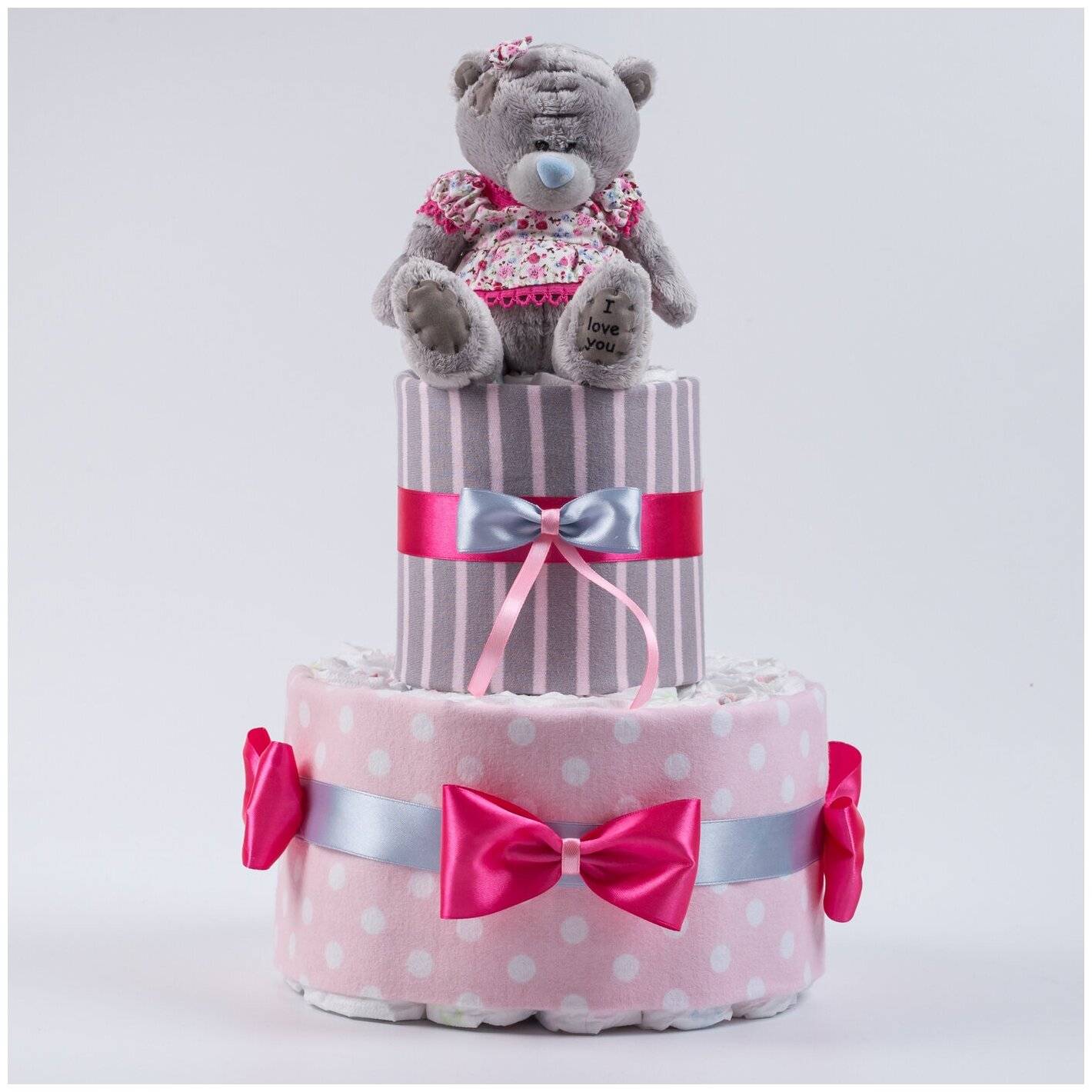 - Торт из памперсов. Оригинальный способ преподнести памперсы – это смастерить из них прикольный торт. Такой презент можно заказать через интернет, но если у вас есть немного свободного времени, то вы без труда сделаете его самостоятельно.
