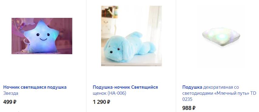 Светящаяся подушка-ночник. Ее не надо подключать к розетке, питание поступает от трех батареек. Это плюшевая подушечка, обычно в форме морской звезды с улыбающейся мордашкой. Она светит мягким, плавно переливающимся светом. Цена 500 рублей.