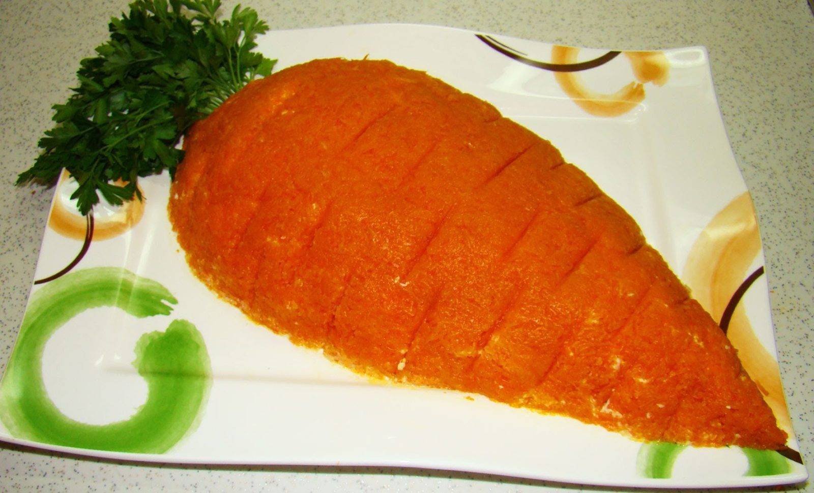 - Сверху присыпать морковкой. При помощи зубочистки сделать бороздки.
