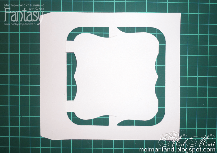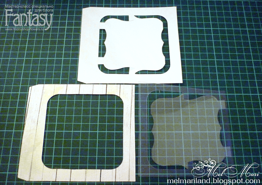 Берем шаблон и делаем заготовки для открытки. Из плотной скрап-бумаги вырезаем 8 заготовок для рамки-основы и 4 из прозрачного пластика.