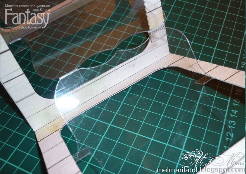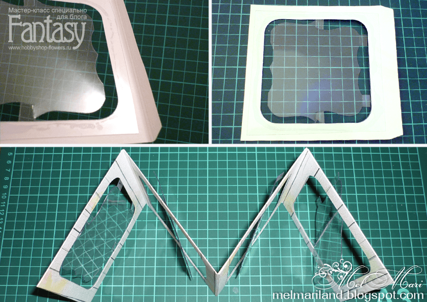 Пластиковые заготовки приклеиваем к основе из бумаги. Чтобы открытка складывалась, на внешних сгибах делаем двойную биговку около 2 мм. Полученные 4 детали соединяем — склеиваем при помощи клея или используем 2-сторонний скотч. Приклеиваем оставшиеся 4 рамки с противоположной стороны.