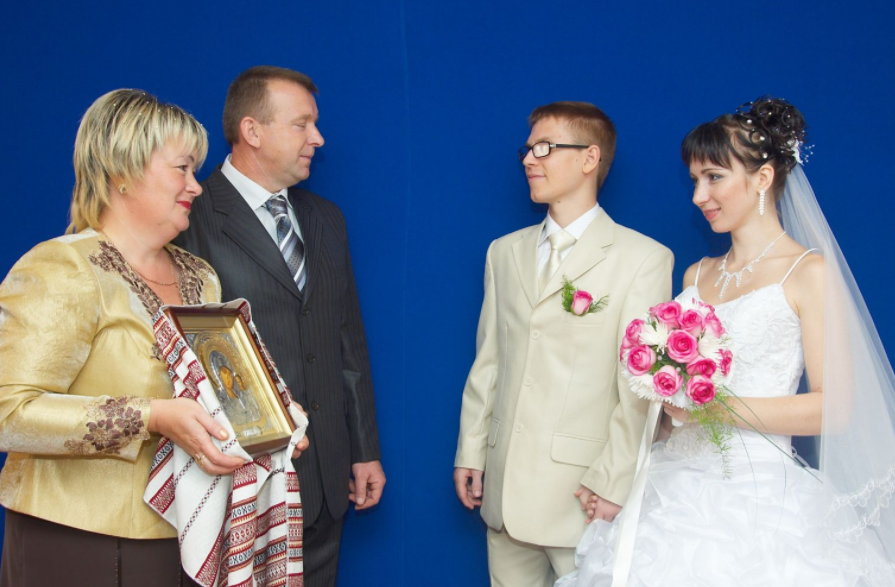 Именно о традиционном благословении мы и поговорим далее. Обычно благословение дают родители обоих брачующихся. Если, к сожалению, кого-то из родителей уже нет в живых – то не стоит искать им замену. Впрочем, если есть члены семьи, по сути выполняющие обязанности родителей (наряду с ними или вместо них) – дяди и тёти, крестные восприемники, бабушки и дедушки, отчим, мачеха – они имеют полное право благословить вступающих в брак.