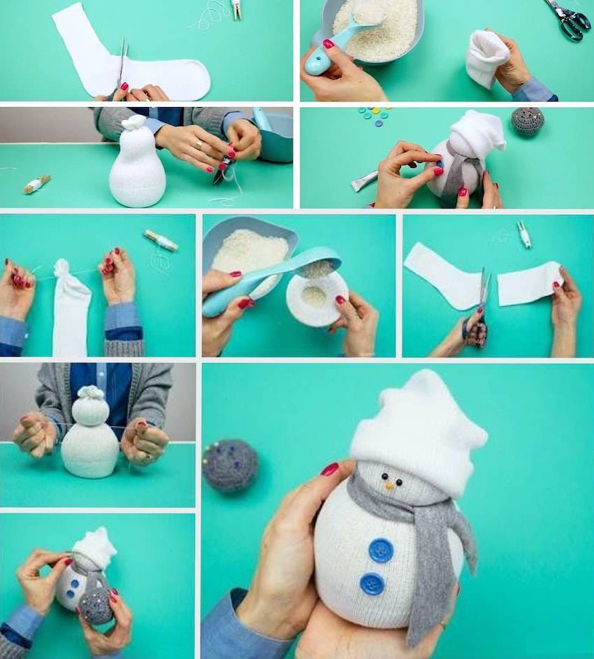 Роль забавного подарка для гостей или украшения журнального столика может исполнить снеговик, для которого потребуется белый носок.