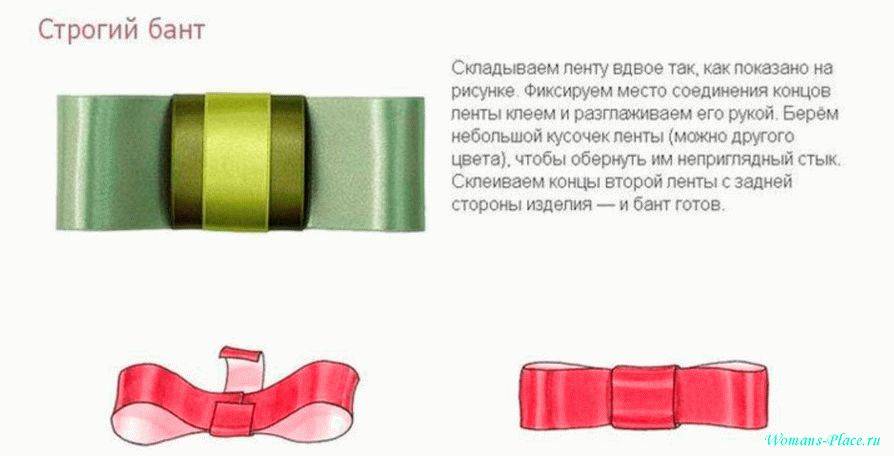 Такой бантик можно завязать из широкой ленты в 5 сантиметров, длиной в 90 сантиметров. Алгоритм действий достаточно прост: