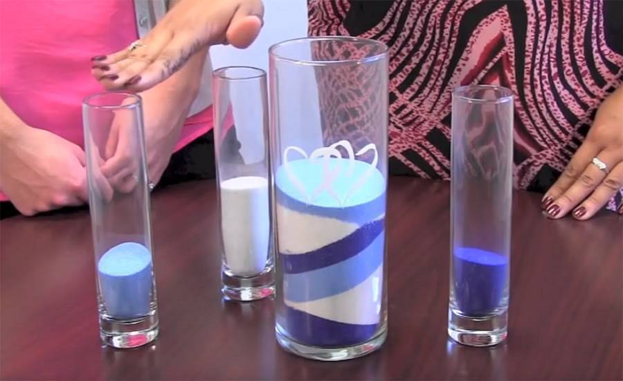 Как быть с двумя другими сосудами? На донышке каждого из них можно оставить немного песка, а затем составить оригинальную композицию с наполненным сосудом в центре.