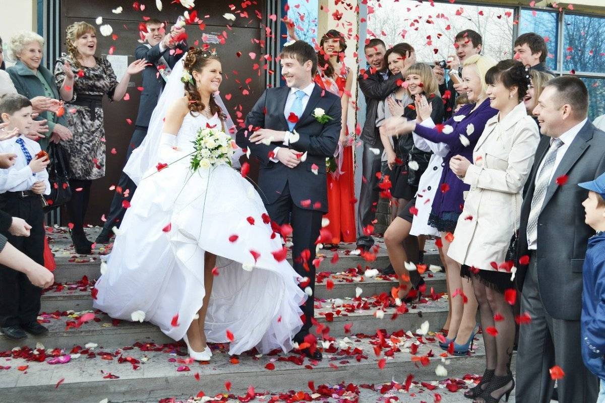 Гости посыпают выходящих молодожёнов рисом (для скорого рождения детей), конфетами (для сладкой жизни), монетками (для богатства) и лепестками роз (для красивой, романтичной совместной жизни).