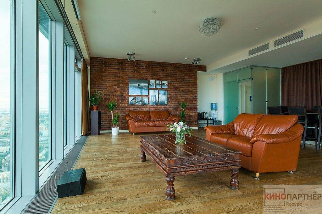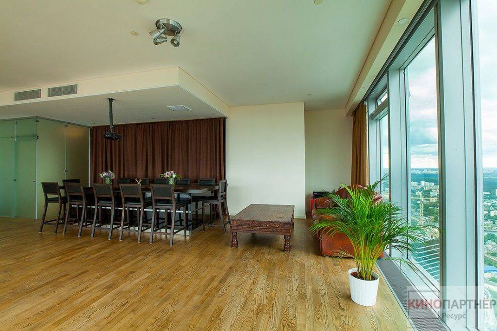 Очень популярные у съемочных групп апартаменты. Расположены в Пресненском районе, в самом сердце Москвы. Элитная студия площадью 100 кв. м. располагается на 60-м этаже. Панорамные окна, захватывающие виды, дорогая мебель – здесь снимались клипы, реклама и сюжеты кино.