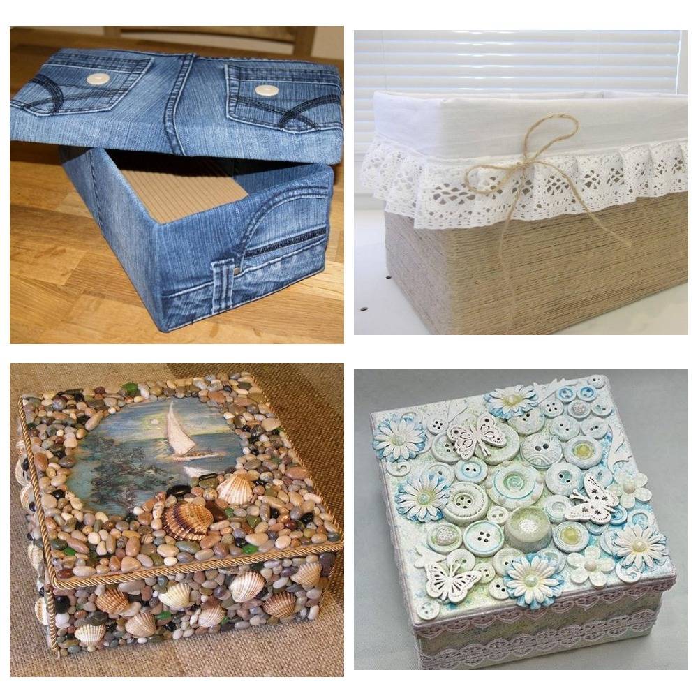Оформить такие боксы можно не только материалами, которые необходимо покупать в магазинах для творчества. Подойдут и простые ткани, ленточки, даже джинсы, которые есть у вас дома. Для украшений используют пуговицы, бусины, бечевку, мешковину, природные материалы, старые игрушки. Главное – включить полет своей фантазии.