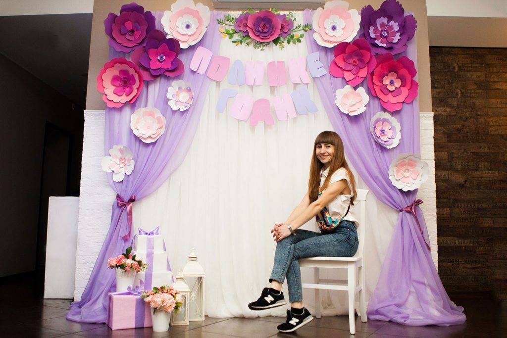 Для более взрослых деток фотозону можно декорировать объемными цветами и различными герляндами. В качестве дополнения можно совместить место для фото и кенди-бар с оригинальными сладостями и коктейлями.