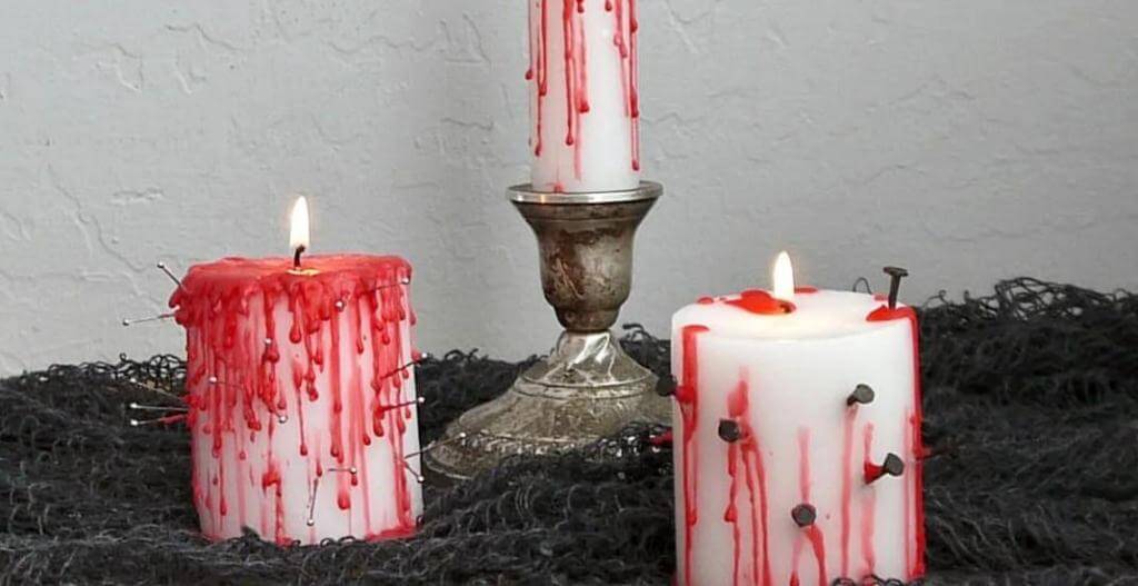 Если дети не будут участвовать в фотосессии, то свечам можно добавить мрачности. «Кровавые» потеки, гвозди и «ведьмовские» булавки — вполне подойдут.