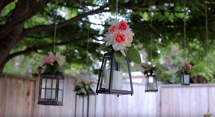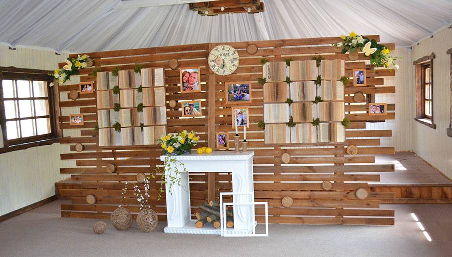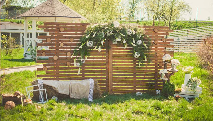Оригинально и атмосферно выглядит фон для фотографий в виде деревянного забора. На нем можно расположить другие тематические детали, например, кашпо с цветами, садовый инструмент или надписи белой краской. К вечеру антураж можно дополнить одноцветной гирляндой.