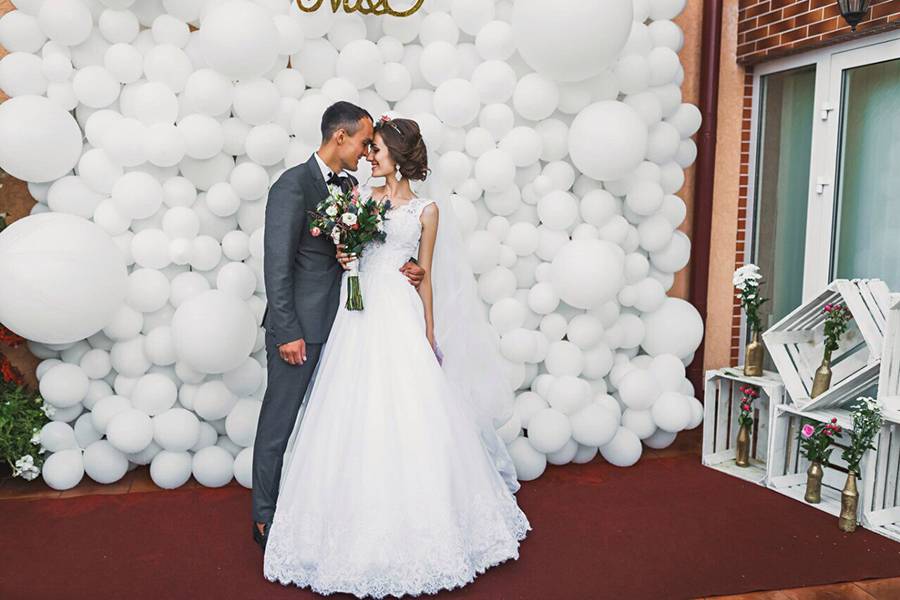 Некоторые молодожены игнорируют этот вариант, поскольку считают его банальным и безвкусным. На самом деле из современных воздушных шаров можно создать интересные композиции. Это может быть парящая цепочка, арка или даже целая стена из «пузырьков» разного размера.