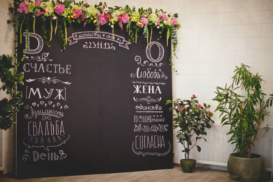 Этот вариант считается одной из модных тенденций. Доска разрисовывается стилизованными деталями, свадебными сюжетами или инициалами молодоженов с помощью цветных мелков.