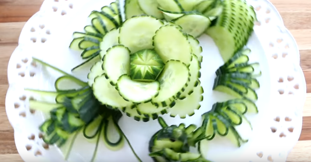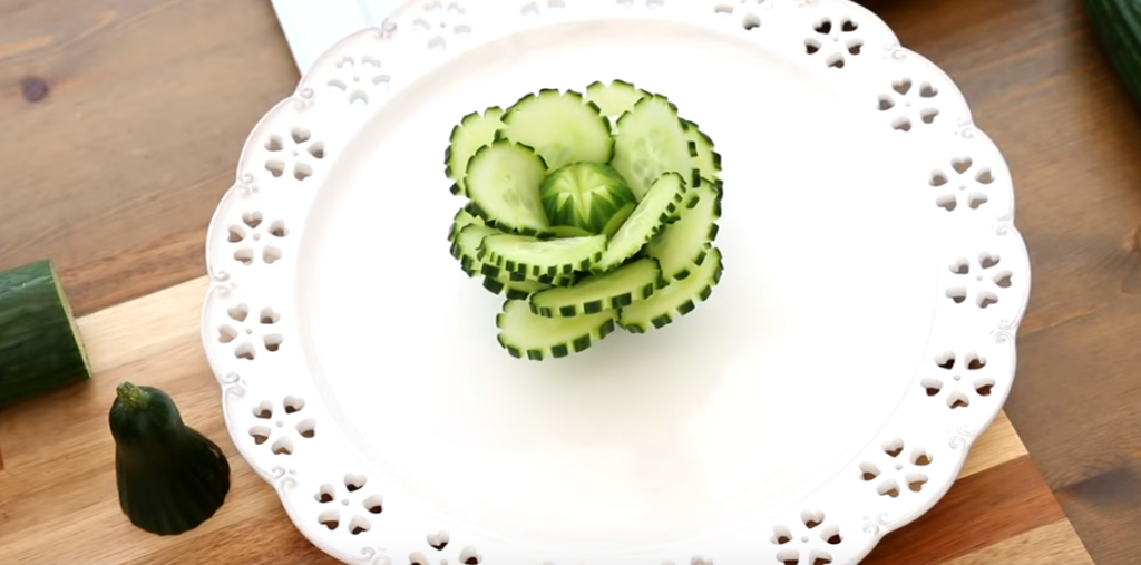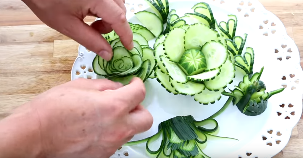 Универсальный сочный овощ, из которого можно формировать красивую зелень, цветы. Для начала попробуем сделать лепестки и собрать вкусную красоту.