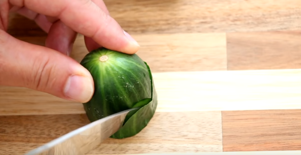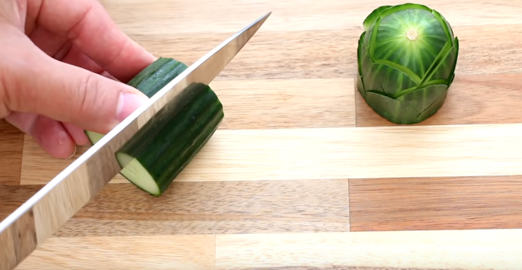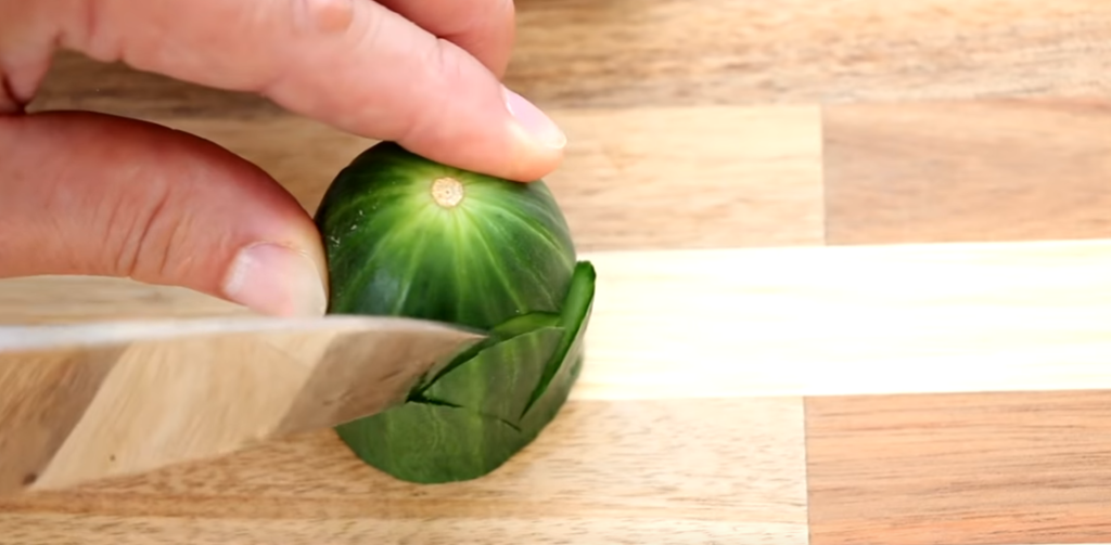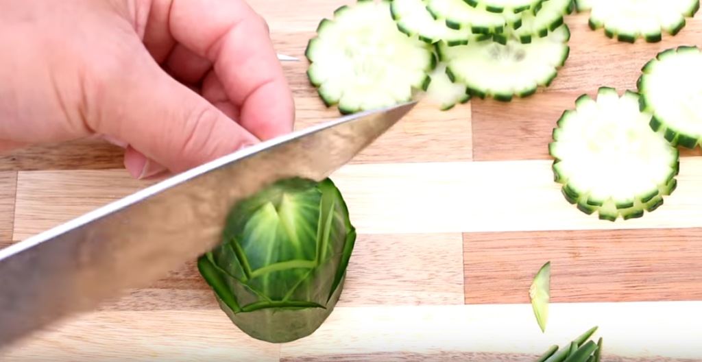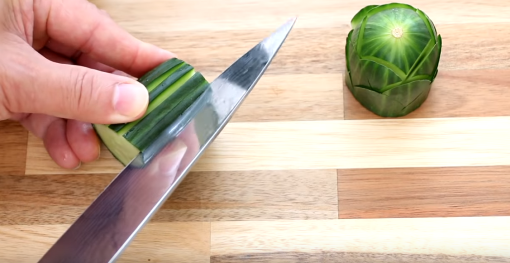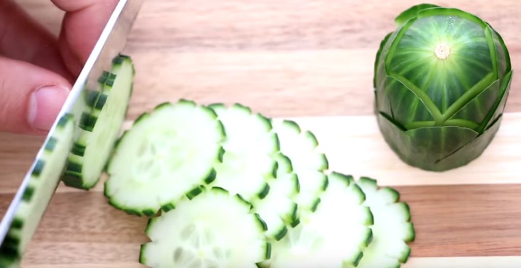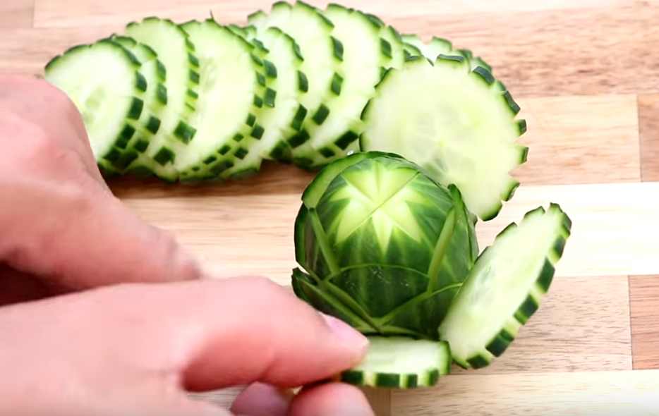 - Тонкими полосками. Плод сначала разрезается на круглые пластики, которые затем мелко шинкуются. Из полосок выкладываются различные фигурки. Например, из зелёных полосок формируются листья цветов.