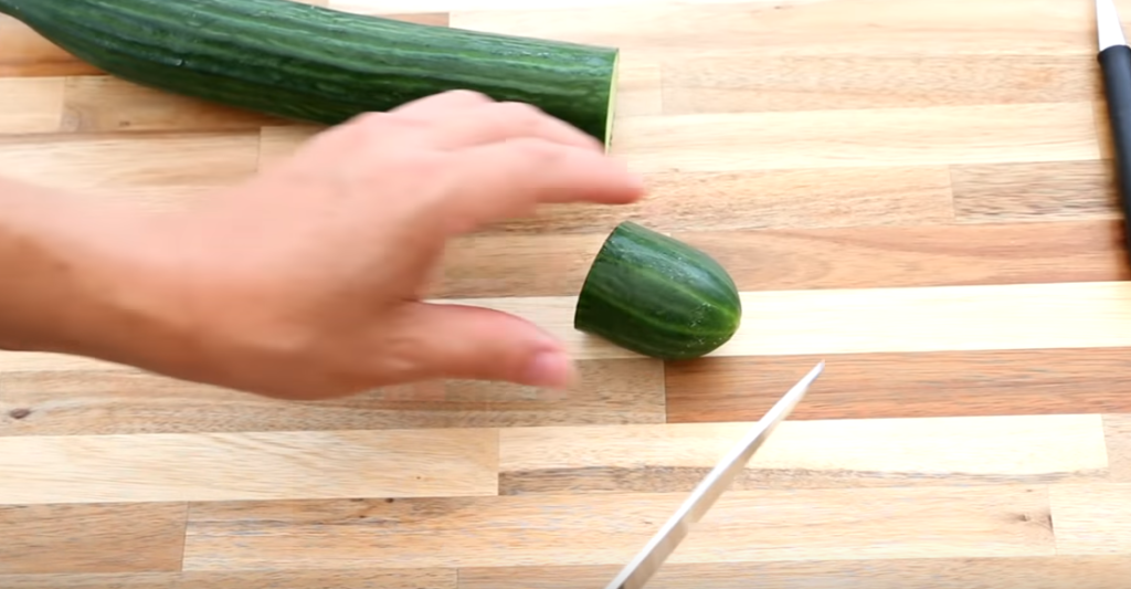 - Для создания кулинарного шедевра понадобиться длинный огурец без пупырышек. Отрезаем от него 1/5 часть.