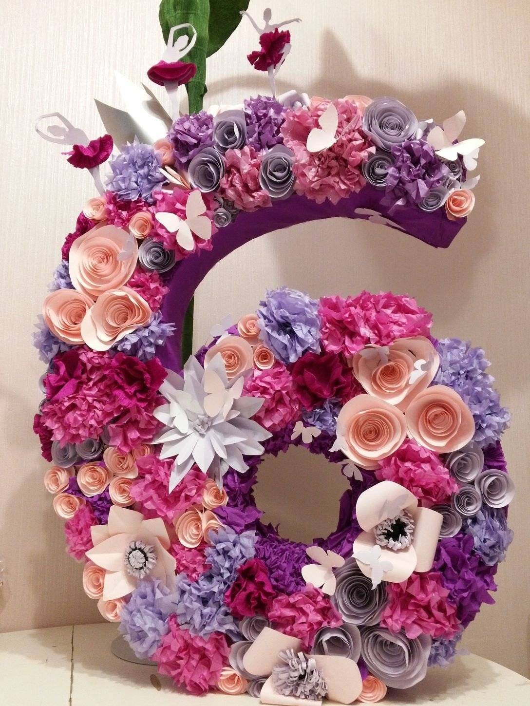 Одним из вариантов для украшения зала являются цветы. Точнее один большой букет, расположенный на фоновой стене напротив зрителей. Собрать его будет не сложно, если смастерить из бумаги большие и красивые цветы.