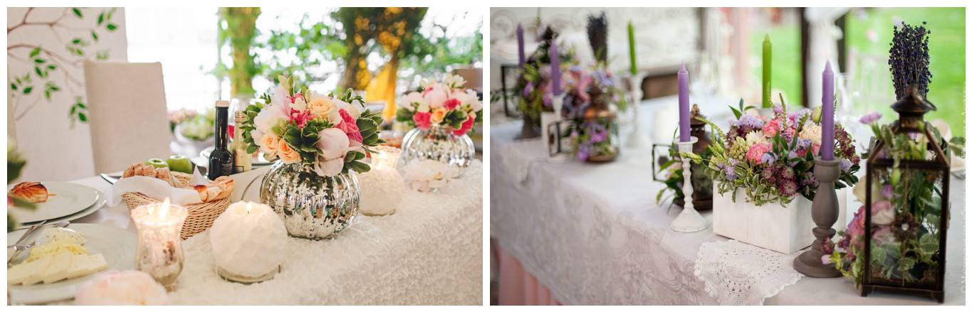 Праздничный стол украшают изделиями из стали, красивыми подсвечниками и посудой, хрустальными бокалами и вазонами. В общей цветовой гамме придерживаются серебряных и металлических нот, добавляют белоснежные аккорды. Белая скатерть и салфетки олицетворяют чистоту отношений, нежность и теплоту любящих сердец. На стол ставят светлые цветочные композиции, преимущественно из хризантем и гвоздик. Интерьер дополняют стеклянными шарами, гирляндами, воздушными шариками и семейными фотографиями. Красивые зеркала подчеркивают характер события, добавляют шикарных нот в композицию.