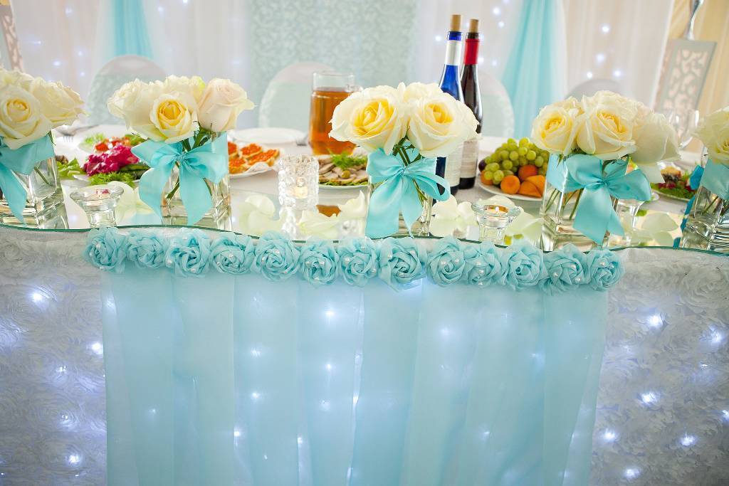 Годовщину свадьбы принято отмечать с родственниками и близкими друзьями. Украсить помещение, в котором будет отмечаться бирюзовая свадьба, желательно в цвета моря и неба. Эти насыщенные нежные тона создадут магическую атмосферу праздника. Скатерти, свечи, шары, гирлянды и другие элементы декора бирюзовых оттенков выглядят стильно и воздушно.