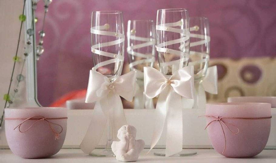 - бокалы одинакового стиля, которые дополнительно украшены лентами из атласа.
