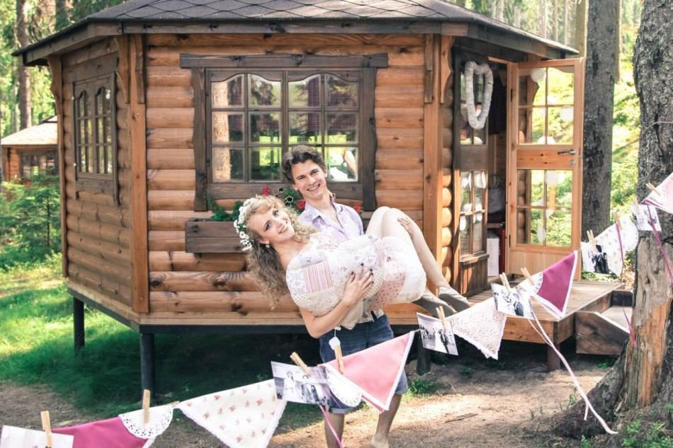 Интересный способ празднования годовщины – провести ее на природе, в деревянном коттедже или домике. Если такой возможности нет, можно оформить в соответствующем стиле свою квартиру. Для этого ее украшают еловыми или другими красивыми ветками, шишками, используют деревянную посуду и декор из этого материала. Фотозону делают из коллажей супругов в рамках, композиций из коричневых и зеленых шариков. На столах расставляют букеты из полевых цветов.