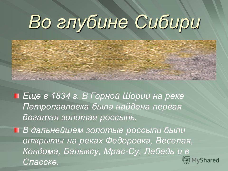 Во глубине Сибири Еще в 1834 г. В Горной Шории на реке Петропавловка была найдена первая богатая золотая россыпь. В дальнейшем золотые россыпи были открыты на реках Федоровка, Веселая, Кондома, Балыксу, Мрас-Су, Лебедь и в Спасске.