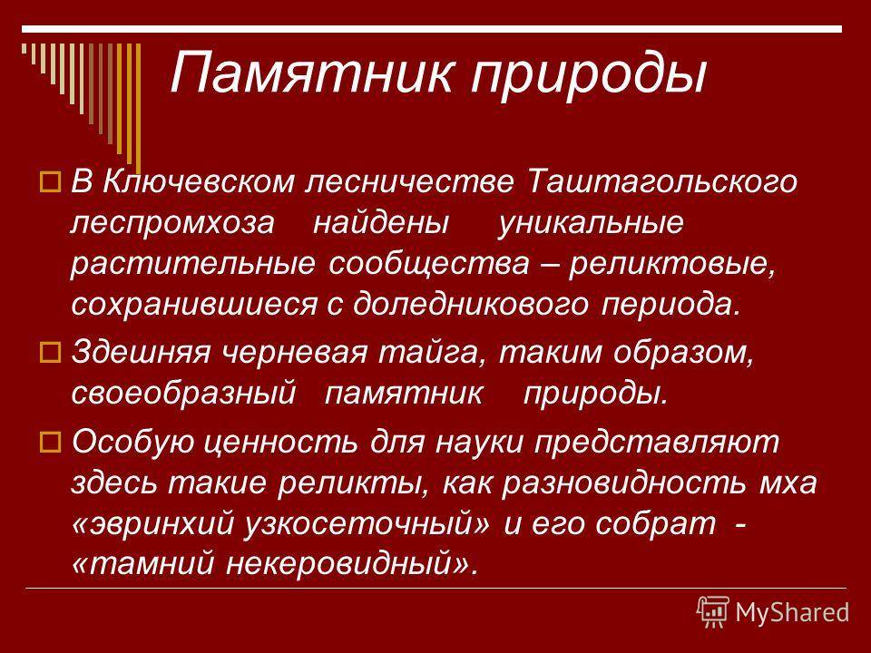 Памятник природы В Ключевском лесничестве Таштагольского леспромхоза найдены уникальные растительные сообщества – реликтовые, сохранившиеся с доледникового периода. Здешняя черневая тайга, таким образом, своеобразный памятник природы. Особую ценность для науки представляют здесь такие реликты, как разновидность мха «эвринхий узкосеточный» и его собрат – «тамний некеровидный».