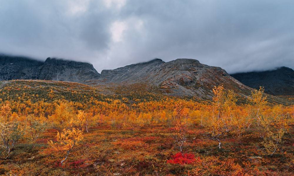 Растительность на скалистых хребтах Хибин специфичная и непривычная для тех, кто не бывал на крайнем севере. Это зона тундры и тайги, где вокруг многочисленных изумрудных озёр вы не встретите густых лесов, а экотропы для туристов проходят среди низкорослых северных берёзок и небольших редких кустарников. Природа в горах осенью выглядит удивительно красиво — буйство самых разных оттенков десятка красок.
