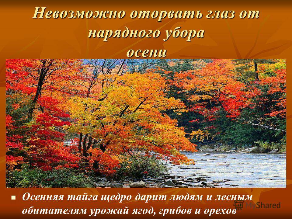 Невозможно оторвать глаз от нарядного убора осени Осенняя тайга щедро дарит людям и лесным обитателям урожай ягод, грибов и орехов