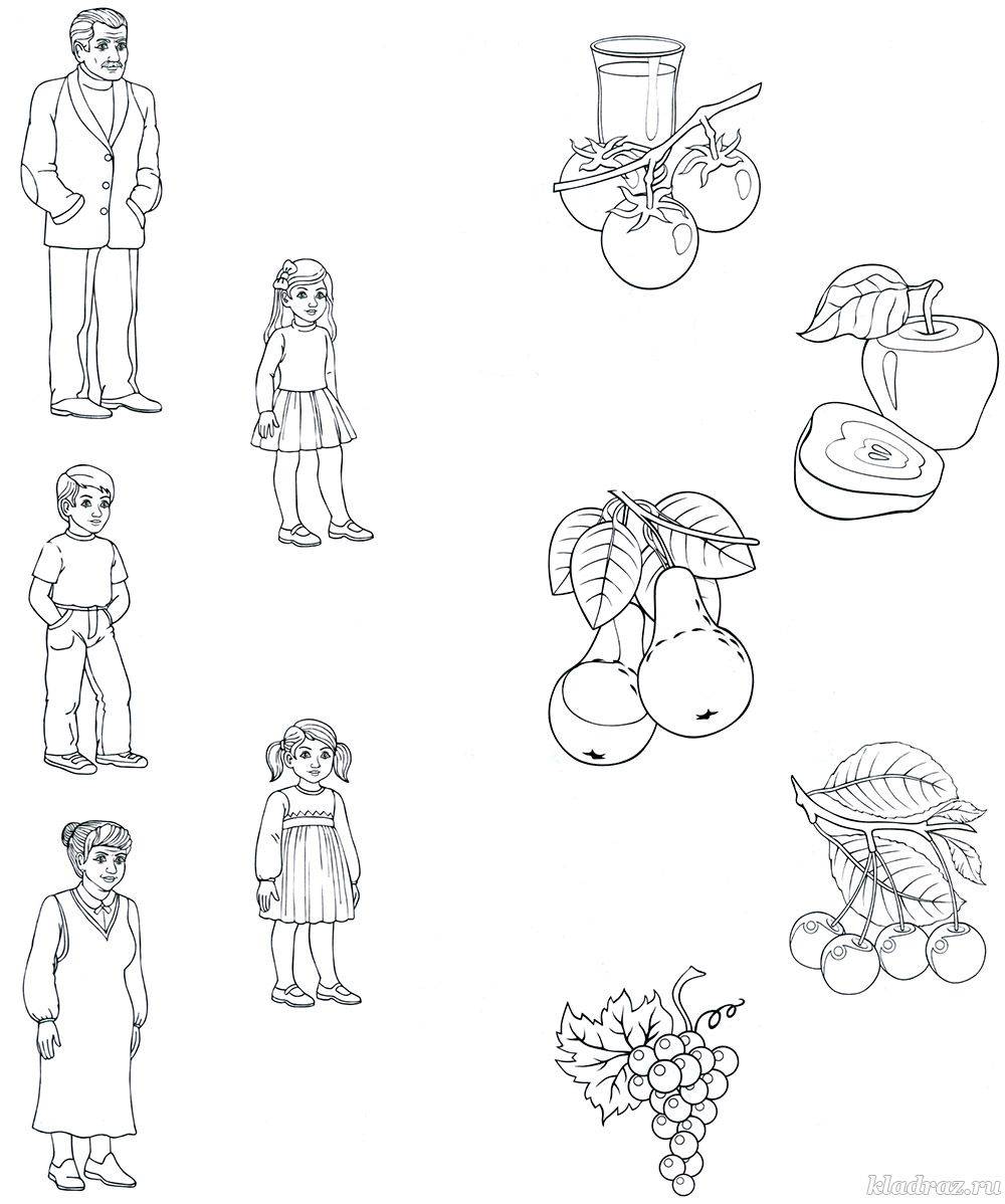 Зимой так не хватает витаминов, поэтому дедушка Боря мечтает о свежих помидорах, а бабушка Валя — о летних яблоках. Внуку Мишеньке хочется винограда, а внучкам Ане и Насте — груш и вишен. Анечка и Настенька — двойняшки, они похожи друг на друга, но носят разные причёски. У Ани два хвостика. Соедини линиями членов семьи с фруктами или овощами, которые они любят.