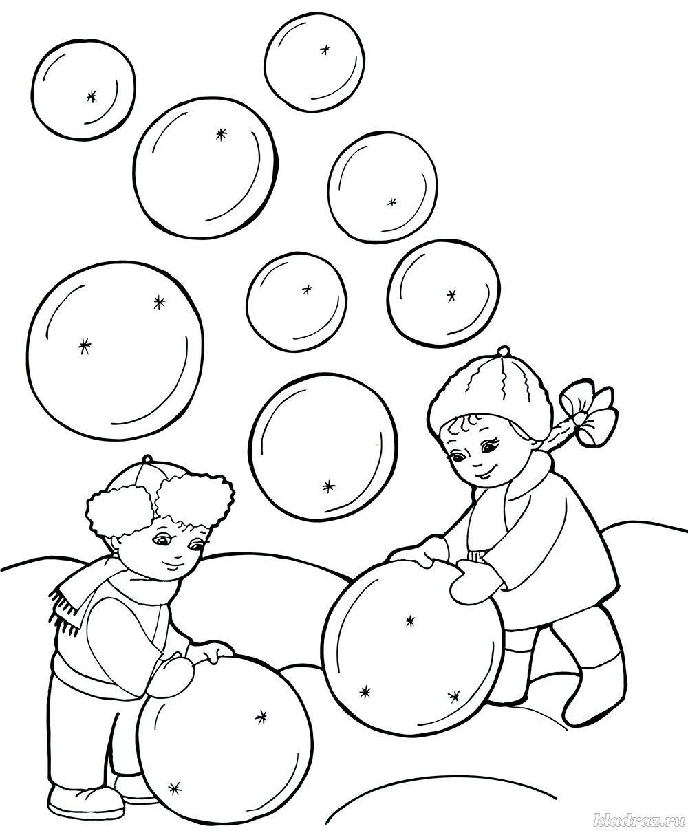 Дети во дворе лепили снеговиков. Посчитай, сколько снежных шаров они уже успели сделать. Раскрась их в разные цвета.
