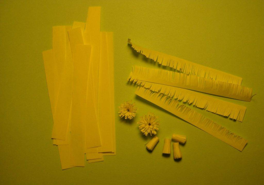 Теперь можно переходить к созданию цветов. Они у мимозы небольшие, но очень пушистые. Для их изготовления понадобятся желтые салфетки, которые нарезаются на полоски по 3 сантиметра, каждая из которых складывается пополам. После этого нужно сделать множество надрезов по одному сантиметру по всей длине полосы. Далее каждый отрезок сворачивается по неразрезанной стороне в рулончик. Вторая сторона должна получиться пушистой. Таких цветочков нужно сделать нечетное количество, а после наклеить их на заранее подготовленную основу-стебель.