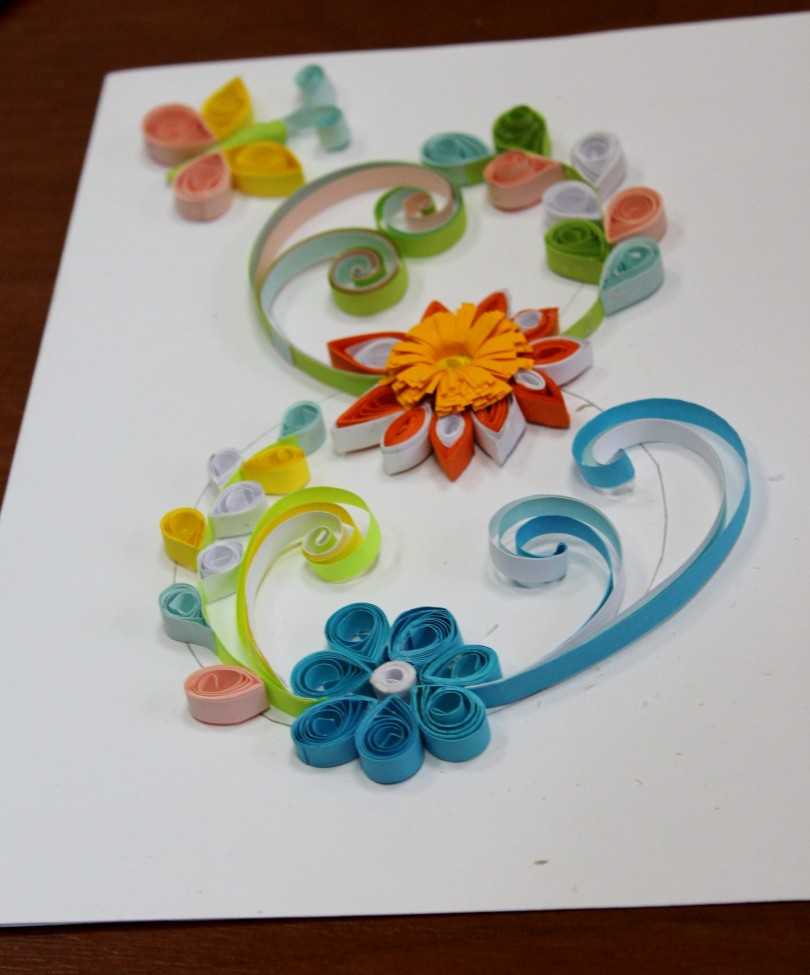 Вот ещё одна поделка выполненная всё из той же цветной бумаги. Правда вот восьмерки придется заготовить воспитателям самостоятельно. Так как для её вырезания и узоров внутри, нам потребуется канцелярский нож. Детям с этим предметом работать категорически запрещено.