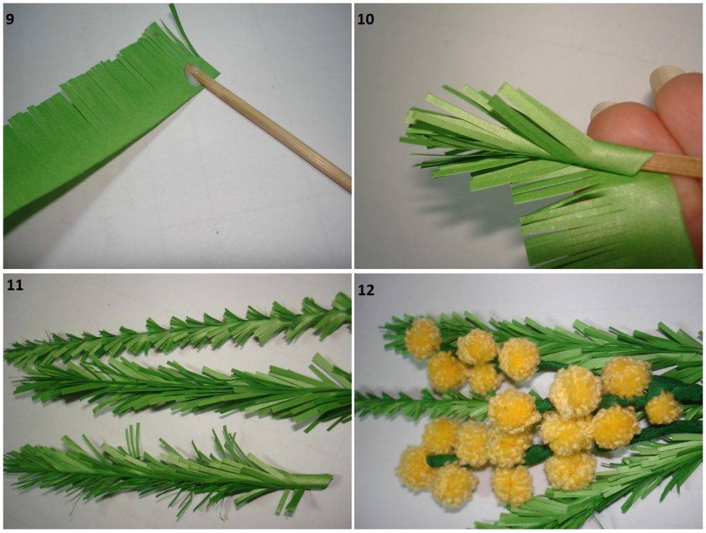 Лситья и стволы мимозы можно изготовить из бумаги, а цветочки можно сделать из выкрашенного пенопласта, пряжи или из салфетки